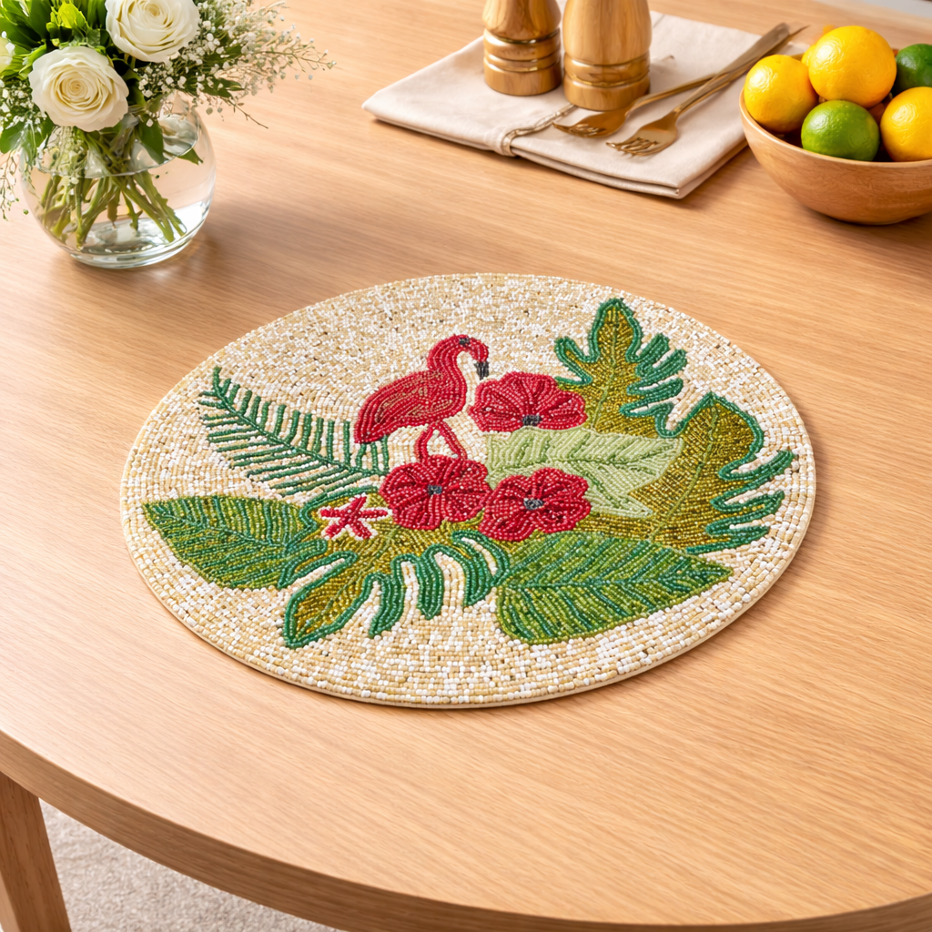Add a touch of elegance to your dining table with the Flamingo Handmade Beaded Placemat. Carefully crafted by skilled artisans, this placemat features premium-quality glass beads arranged in a sophisticated pattern that enhances any dining or home décor setting.