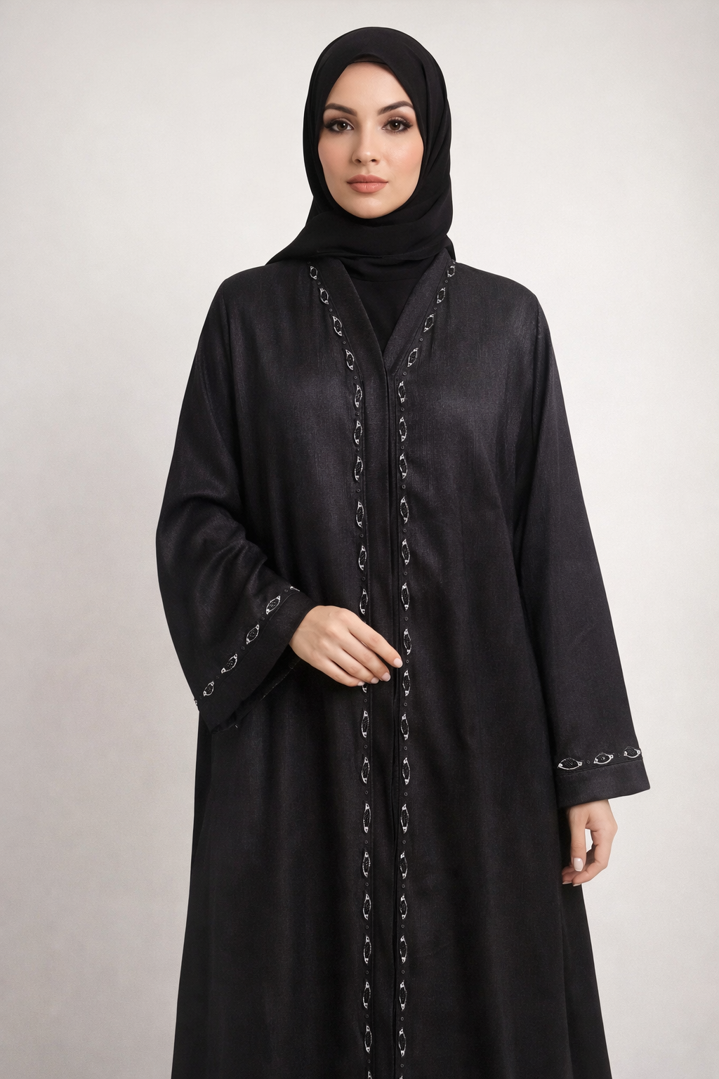 Experience timeless sophistication with this jet black front-open abaya, designed for women who appreciate refined modest fashion. The abaya features delicate braided detailing running along the front placket and sleeve cuffs, adding subtle texture and depth.